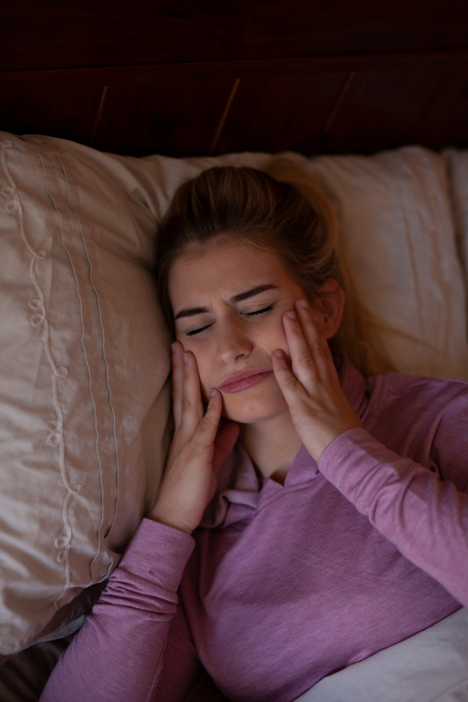 Headache is a common symptom experienced by those who grind their teeth at night while sleeping (Bruxism). Other symptoms may include muscle aches, neck and shoulder stiffness, TMJ-related pain, tinnitus, and sleep issues. Bruxism can also have some long-term oral health issues. The most notable ones can be jaw damage and chipped or cracked teeth.